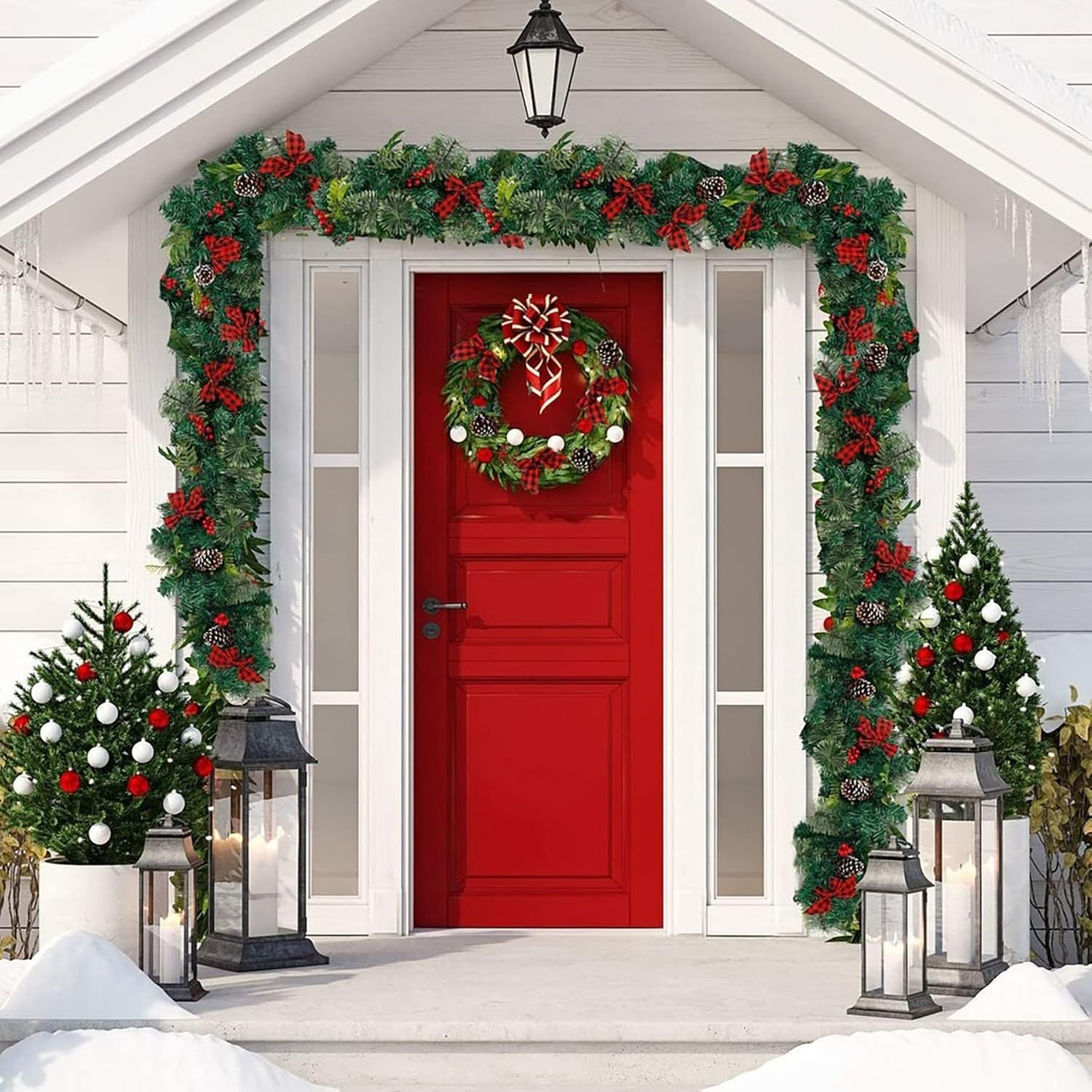 Ghirlanda este realizata din PVC si are lungimea de 270 centimetri. Ghirlanda confectionata din frunze verzi este impodobita cu fundite rosii si conuri de brad.