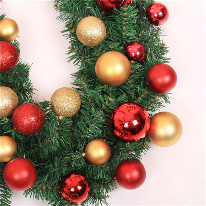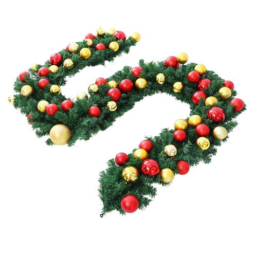 Ghirlanda este realizata din PVC si are lungimea de 270 centimetri. Ghirlanda confectionata din frunze verzi este impodobita cu globuri de Craciun aurii si rosii.