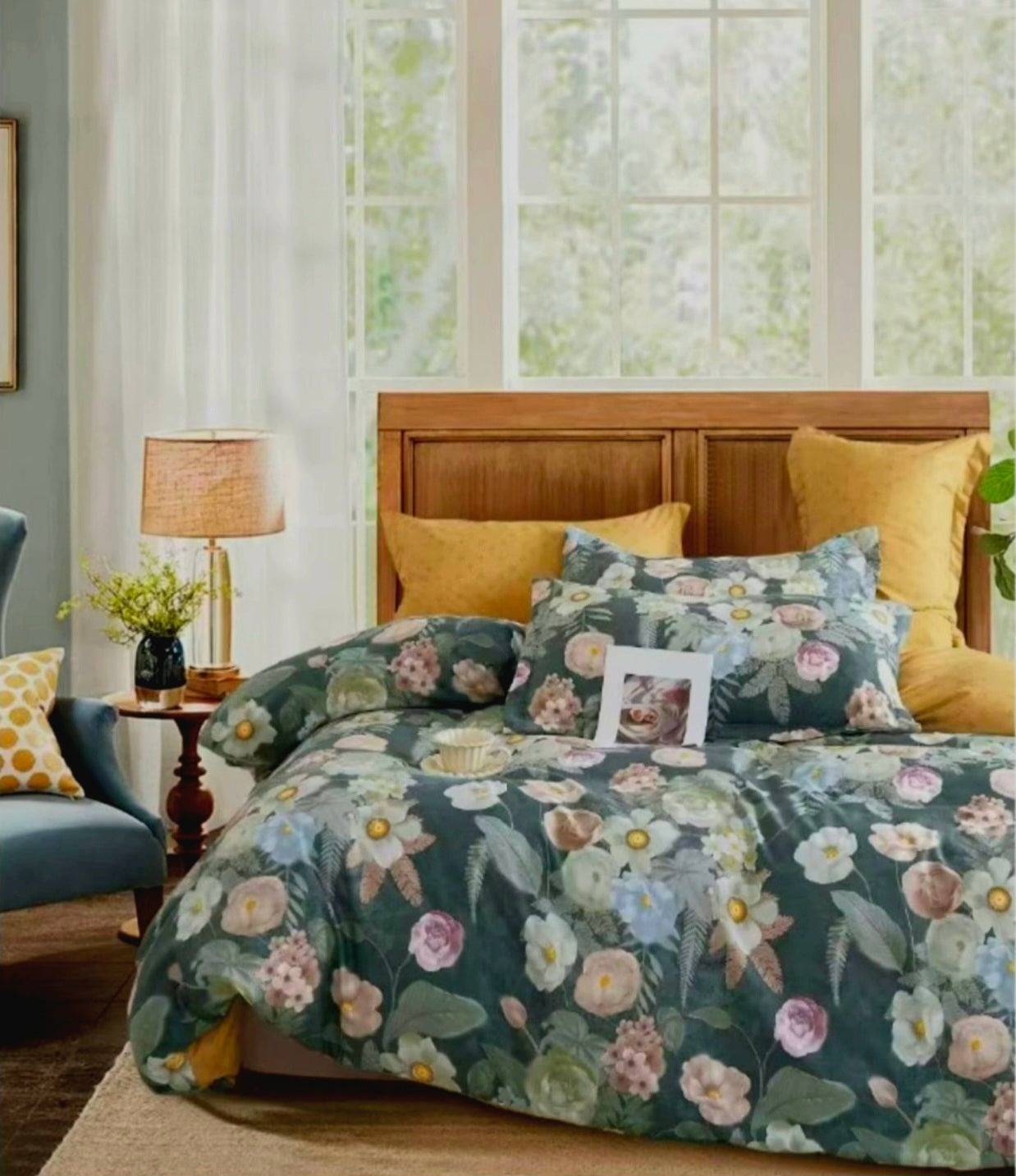 Lenjerie de pat dublu bumbac HIPOALERGENIC – 6 piese-230 x 250cm Verde cu Flori