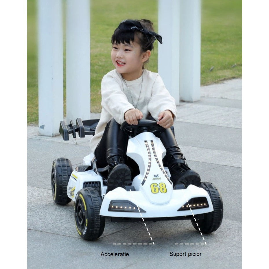 Masinuta Electrica, Tip Kart, cu Telecomanda, Dimensiune Reglabila, 2 Viteze, Sistem de Lumini si Sunet, Pentru Copii intre 1.2 - 1.6 Inaltime, 105 x 55 x 50 cm, Alb