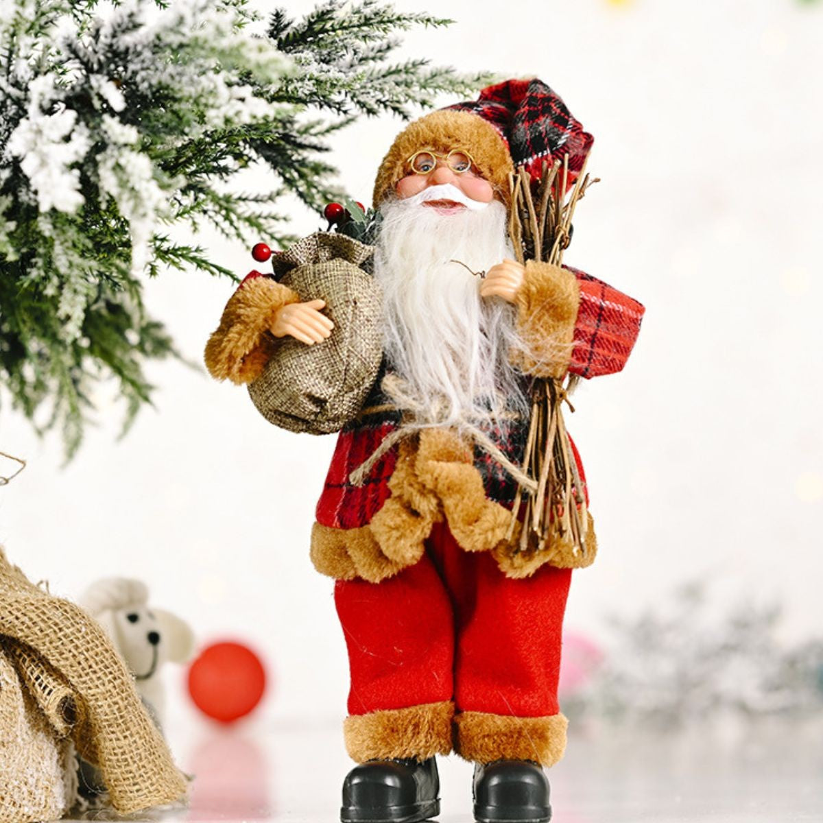 Această jucărie decorativă înfățișează pe Moș Crăciun, confecționată din materiale moi și plăcute la atingere, precum lână, țesătură de pluș și poliester. Cu o înălțime de 35 cm, această figură este ideală pentru a aduce spiritul Crăciunului atât în interiorul locuinței, cât și în decorul exterior.