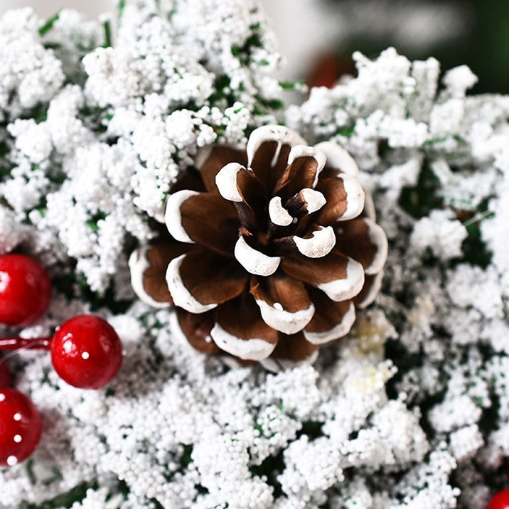 oronita pentru Craciun, diametru 32 cm, din brad artificial, decorata cu conuri si merisoare, inzapezit