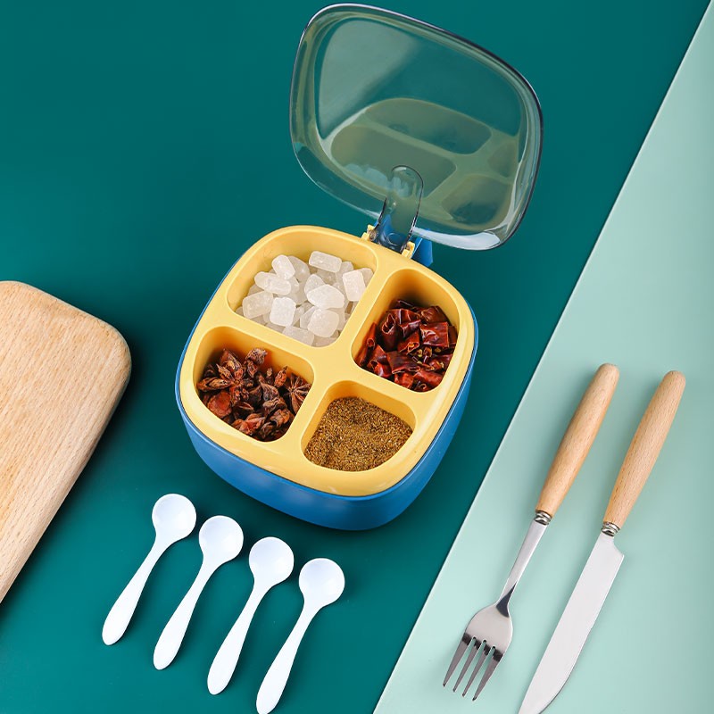 Organizare eficientă: Acest recipient dispune de 4 casuțe separate, care permit depozitarea și organizarea condimentelor, precum sare, cimbru, piper și alte condimente preferate. Astfel, vei putea găsi rapid condimentele dorite și vei evita amestecarea lor.