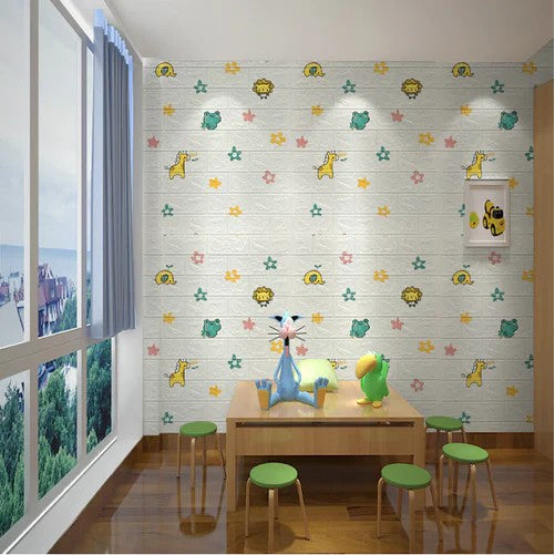 Set 10 Placi Tapet 3D,70 x 77 cm, Grosime 3 mm, din Polietilena, Tip Caramida, Model Animalute si Floricele, Suprafata acoperita 5.3 mp, Alb