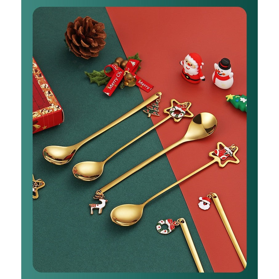 Set 4 Lingurite, Tema Craciun, Model Carry The Merry, 4 Modele Tip Pandantiv, din Otel Inoxidabil, 19 x 16 x 2 cm
