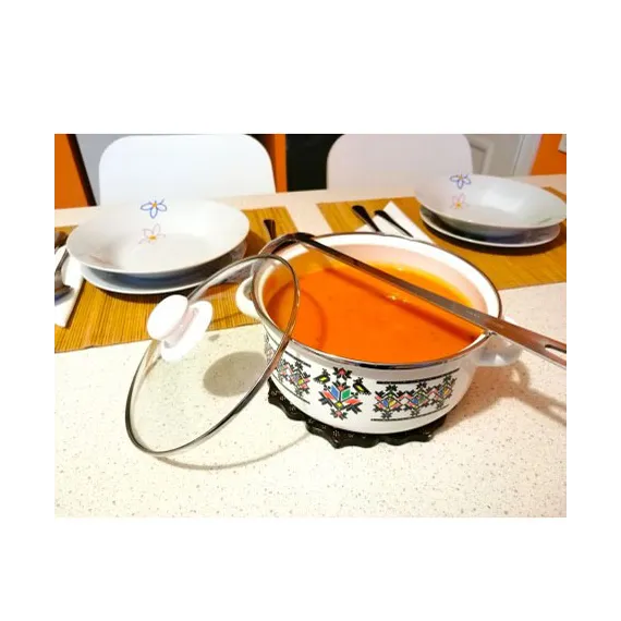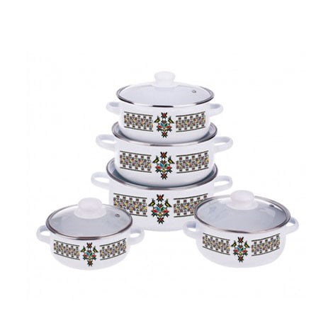 Setul este format din 5 oale emailate cu capac din sticla termorezistenta ce pot fi utilizate pentru o gama variata de mancaruri.