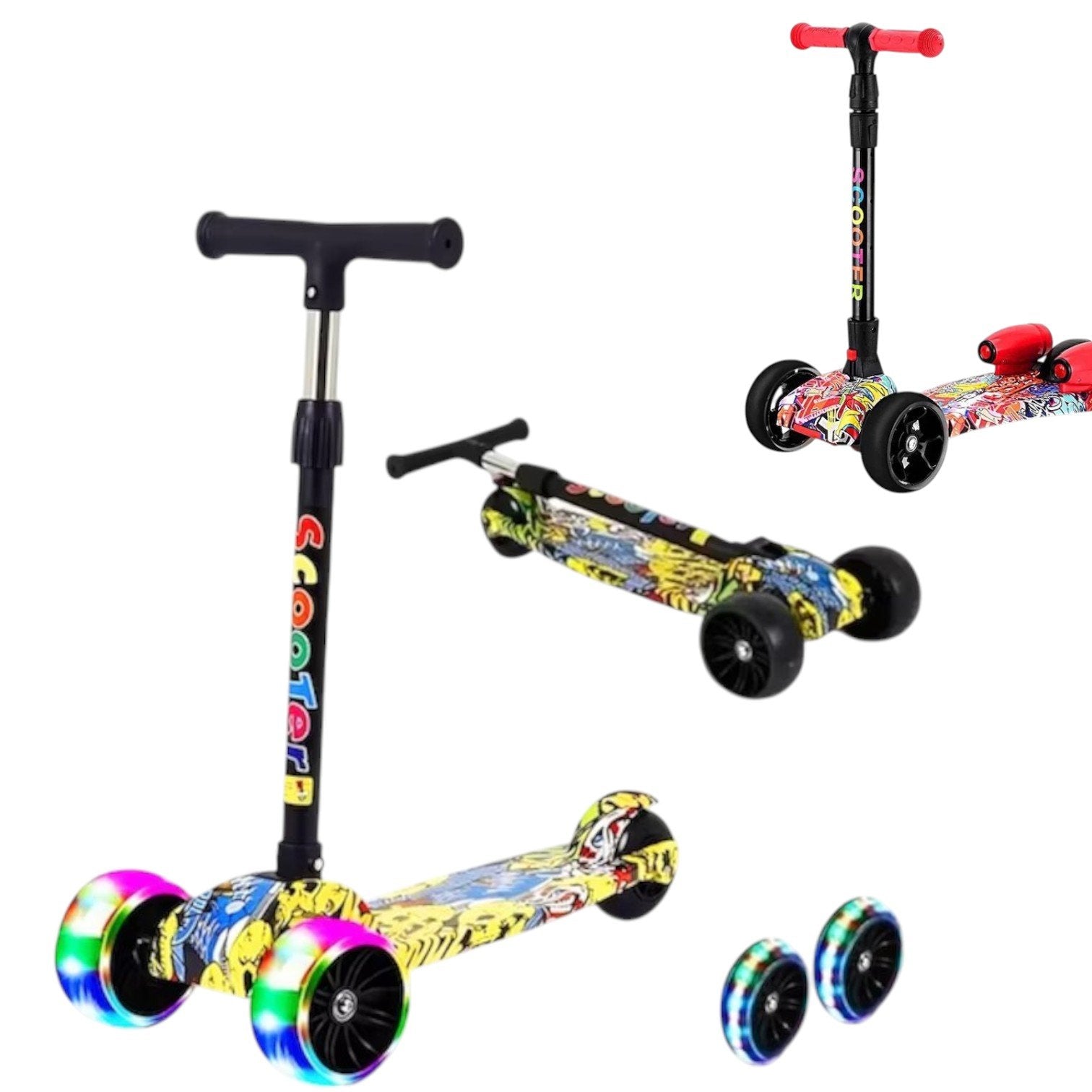 Trotineta cu trei roți LED pentru copii, cu dimensiunile de 80x60 cm, este un mijloc de joacă și deplasare perfect adaptat nevoilor celor mici. Creată pentru a combina distracția cu dezvoltarea echilibrului și a coordonării, această trotinetă este ideală atât pentru băieți, cât și pentru fete, datorită designului său unisex și modelelor colorate atrăgătoare. Fie că este folosită în parc, în curte sau în zone pietonale, oferă copiilor o experiență activă și sigură.
